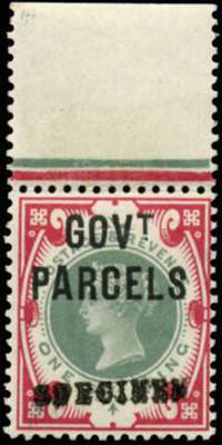 1900 1s Green and carmine (Govt. Parcels). Very fine unmounted o.g. top marginal example overprinted "SPECIMEN" type 9. Spec. L30s. Ex Michael Astley Collection.