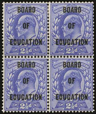 1902 2½d Ultramarine (Board of Education). Superb unused o.g. block of four, (lower pair unmounted o.g.) of this rare departmental issue. A stunning multiple in a beautiful deep bright colour. Ex DLR archives & Michael Astley Collection. SGO85, Cat £20,000+