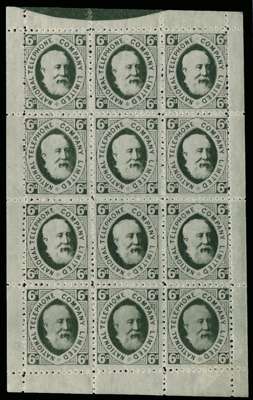 1884 6d Olive green "National Telephone Company". Very fine unused o.g. complete sheet of twelve. The National Telephone Company stamps bearing the portrait of Colonal Robert Raynsford Jackson (Chairman of the National Telephone Company) caused considerable offence at the time of issue due to the omission of the portrait of Queen Victoria and were officially withdrawn from use in 1891at the request of the Post Master-General. Very rare, this difficult 6d shade is rarely seen as a complete sheet.