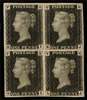 1840 1d Black (VR Official). Very fine unused part o.g. four margin block of four lettered KI-LJ, patchy gum and a pressed horizontal crease at foot nevertheless an attractive multiple from the Dublin Post Office Find. Wonderful colour. SGV1, Spec. VR1. Cat £125,000. Ex. Earl of Crawford & "Verus". Cat £125,000