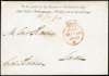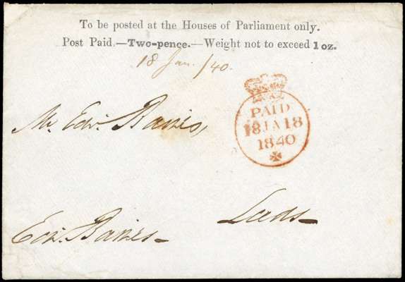 1840 2d House of Parliament envelope, addressed to Leeds by Sir Edward Baines to his son Edward Baines, dated in manuscript ‘’18 Jan /40'' showing ‘PAID’ Crown datestamp in red for 18 JA 1840, some peripheral creases and small tear at top, otherwise fine, a very rare envelope. SG PE3