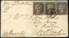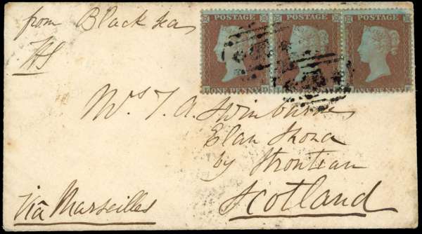 1854 Crimean War cover to Scotland, endorsed ‘’From the Black Sea'' bearing 1d red-brown (LD-LF) horizontal strip of three, showing strikes from */Crown/* cancel (type R1), backstamped by British-Army-Post Office cds for DE 28, London and Glasgow d/s for JA 9 1855 and Strontian receiving h/s for JA 11 1855, minor mark, a rare cover. SG 17