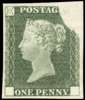 1840 1d Rainbow Trial (State 3d), imperforate four-margined example, in green on thick bluish laid paper. Horizontal crease, otherwise fine. Spec. DP20(3)d.