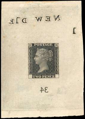 1871 2d Ormond Hill die proof. Superb example printed in black on thin hard yellowish-white wove paper (75 x 53mm) with "NEW DIE" reversed above design and "34" below. Very rare, only two or three examples are believed to exist in private hands. Spec. DP46a, £15,000.