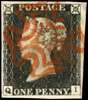1840 1d black Plate 2 (QI) four close to large margins, struck by bold red MC, fine. SG 2, £350