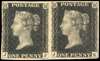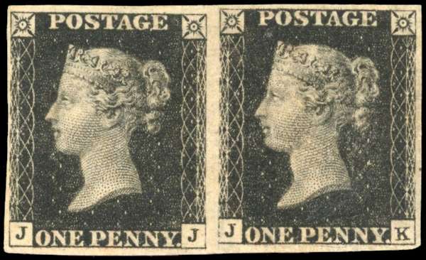 1840 1d black Pl. 5, horizontal pair (JJ-JK), with four good margins, mint, large part o.g., the right stamp with a toned spot, otherwise fine. An attractive multiple. SG 2, Spec. AS25, £35,000.