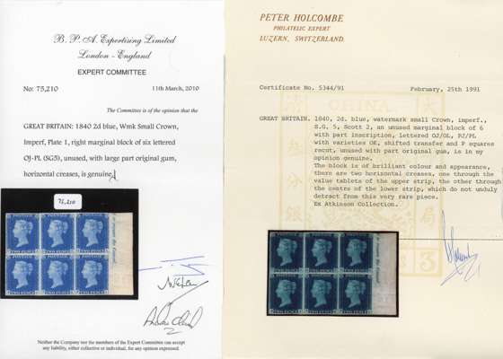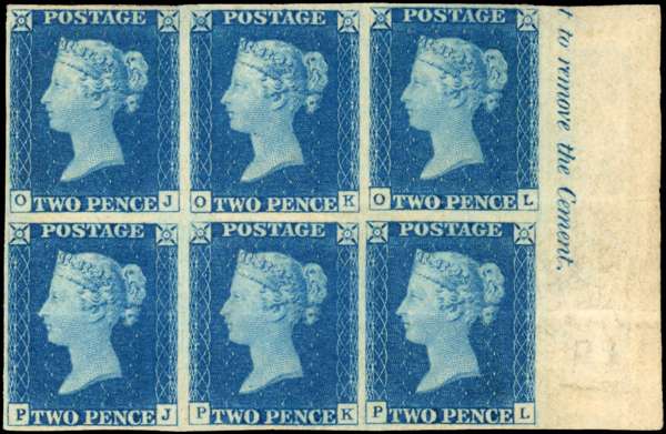 1840 2d blue Plate 1 (OJ-PL) in right-marginal block of six with part inscription, good to very large surrounding margins, mint brilliant large part o.g. with a couple of horizontal creases, not at all detracting from otherwise magnificent colour and appearance, a rarity; one of the great philatelic showpieces with impeccable provenance. Holcombe (1991), Diena (1991) & BPA (2010) Certificates. SG 5, cat £180,000