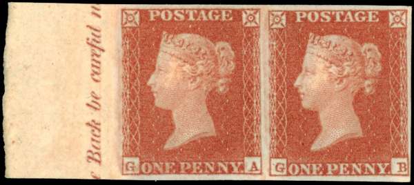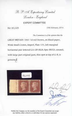 1841 1d red-brown Plate 131, left-marginal horizontal pair (GA-GB) with inscription, four good to large margins, mint, large part o.g., right stamp with small thin spot at top, otherwise a fine pair. BPA Certificate (2014). SG 8