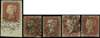 1841 1d red-brown lettered RF, group of five with numbers in Cross. Number 1 on piece (Plate 36), 4, 6 (Plate 38), 9 and 10, all with four margins. SG 8m