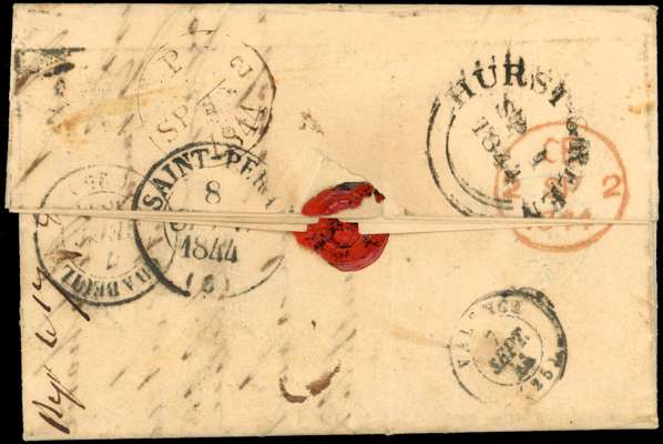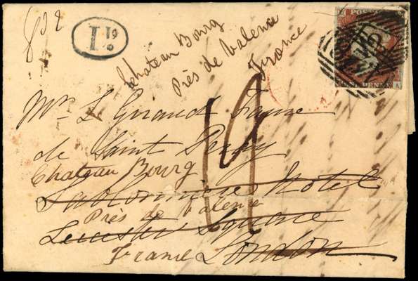 1844 entire letter from Hurst Green addressed to London bearing 1d red-brown Plate 45 (HA) showing ‘428’ numeral, superimposed by London ‘12' numeral, re-addressed to France, with additional ‘19’ charge in m/s and ‘1D' oval h/s cancel, backstamped by London transit and despatch marks and French Valence, Chabeuil and Saint Peray markings for 7-8 Sept, archival folds and small puncture to address panel, otherwise fine, an interesting and unusual cover. SG 8