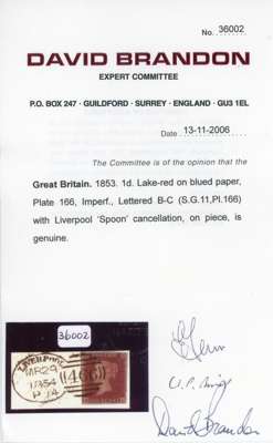 1841 1d lake-red Plate 166 (BD) just touching to good margins used on piece, showing fine strike of Liverpool spoon cancel for MR 29 1854, most attractive example of this scarce shade. SG 11 cat £850