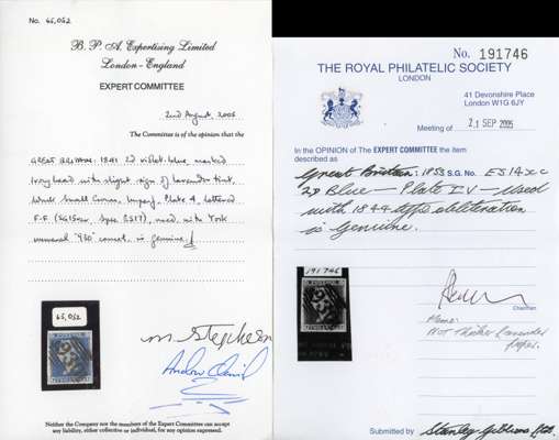 1841-51 2d blue Plate 4 (PF), four margins, with a fine strike of 1844 type ‘930’ barred numeral postmark for York. A lovely example. RPS cert (2005) . Also offered with a BPA cert (2005) noting it as “violet-blue, marked ivory head with slight sign of lavender tint”. SG 14, Spec. ES14wa.