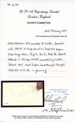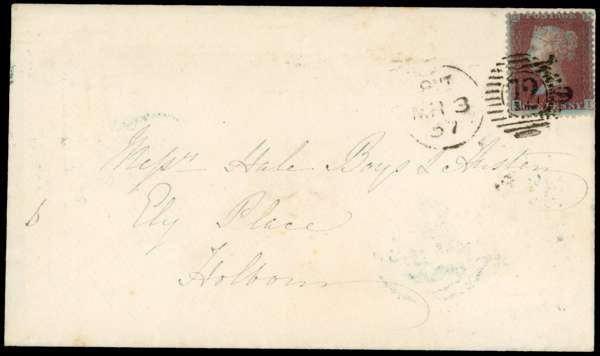1854-57 cover to Holborn bearing 1d deep claret on deeply blued paper Plate 47 (II) tied by London numeral for MR 3 57, backstamped by Romford datestamp in blue for MR 3, a couple of minor tones, still a most attractive item with this rare shade. BPA Certificate (2007). SG 29; Spec. C8(6)