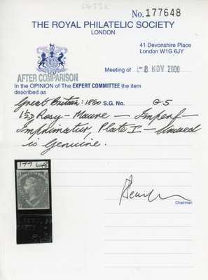 1860 1½d rosy mauve Plate 1, imperforate imprimatur example, unused. Fresh, with a splendid ‘ivory head’ on reverse. RPS Certificate (2000). SG 53a