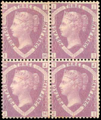 1860 1½d rosy mauve Plate 1 (IH-JI) in block of four, mint large part o.g. a shortish perf at top and few toned perf tips, still a fine and rare multiple of this stamp, prepared for use but not issued. SG 53a cat £18,000+