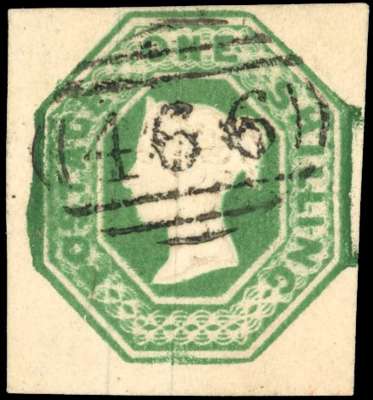 1847-54 1s deep green (Die I) four good to very large margins, neatly struck by crisp ‘466’ numeral for Liverpool, a premium example. SG 56, £900