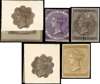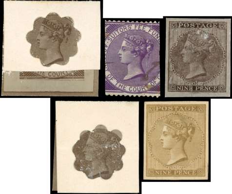 c.1862 9d ‘paste up’ essay in straw, made by pasting a printed frame upon a head taken from a Suitors Fee Fund stamp of the Chancery Court, being very close to the issued design, lettered VA-CO in the corners, Offered with four items, bromides etc, illustrating the composition of this item, very fine and rare, a unique archival piece. Ex Sugden and Latto. SG 82