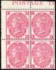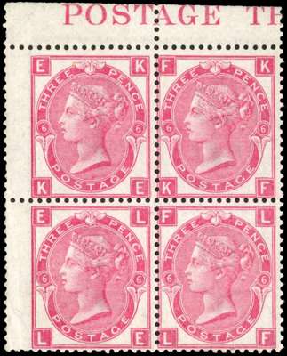1870 3d rose Plate 6 upper left corner block of four, mint with two stamps unmounted; selvedge reduced, pressed bends and one short perf at left, nonetheless a scarce and attractive multiple. SG 103, £3400