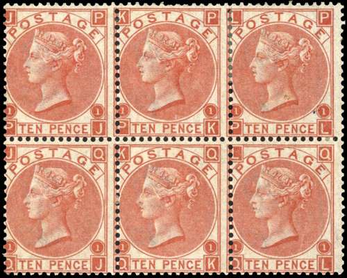 1867-80 10d red-brown Plate 1 (PJ-QL) in block of six, mint large part o.g., minor surface blemish to ‘PL’ still a most attractive and rare multiple, believed to be the largest block in private hands. Ex Latto. SG 112 cat £13,500+