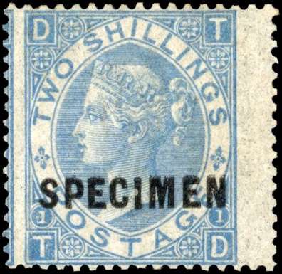 1867 2s cobalt Plate 1 (TD) wing marginal, overprinted SPECIMEN type 5, mint part o.g., scarce. SG 120as