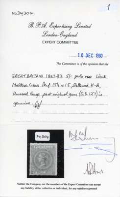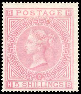 1874 5s pale rose Plate 2, mint. Very fine and fresh o.g. example lettered HB. Lovely delicate colour, a choice example of this rare stamp. Spec. J121(2). 1990 BPA Certificate. SG 127, £10,000.