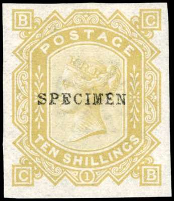 1878 10s imperforate colour trial in bistre on paper with Maltese Cross watermark, overprinted SPECIMEN Type 9. Large part o.g., very attractive. SG 128