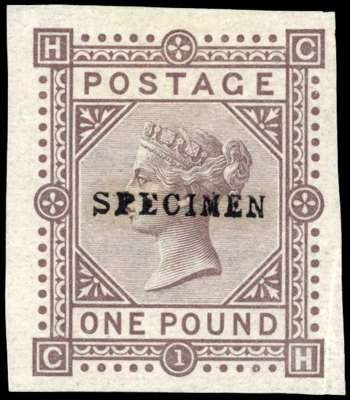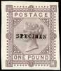 1878 £1 brown-lilac Plate 1, imperforate colour trial in the issued colour, part o.g. on paper watermarked Maltese Cross. Overprinted SPECIMEN Type 9. Rare in the issued colour. SG 129