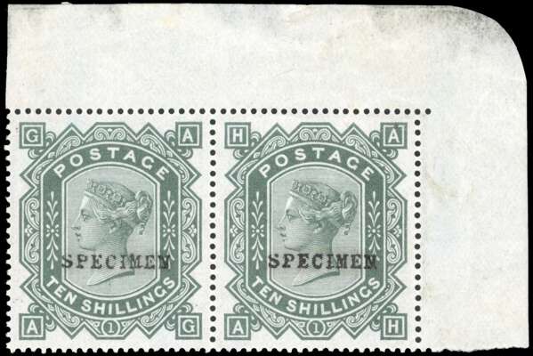 1883 10s greenish grey (AG-AH) watermark Anchor on blued paper, top right corner horizontal pair overprinted SPECIMEN type 9, mint large part o.g. (hinged on margins); some thins to top margin, still a very rare and attractive multiple. SG 131s cat £17,000+