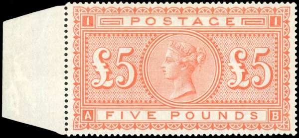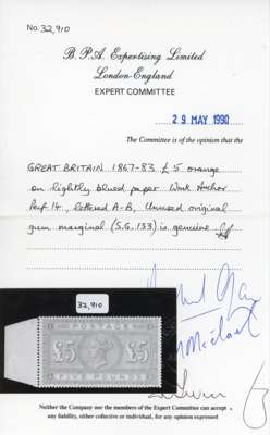 1867-83 £5 orange (AB) on blued paper, left marginal, mint large part o.g. a very fine example of this rarity. BPA Certificate (1990). SG 133, cat £60,000