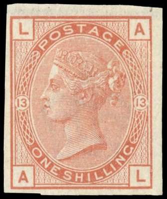 1880 1s orange-brown Plate 13. Very fine o.g. imperforate imprimatur lettered AL, from when the plate was re-registered after alteration. Scarce, one of only 22 possible examples, many of which are in institutional collections.
