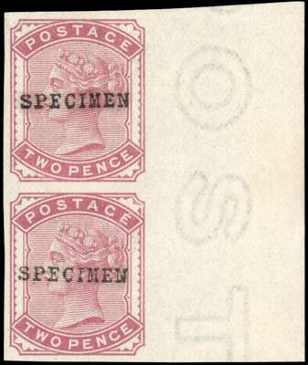 1880 2d deep rose right marginal vertical pair of imperforate imprimaturs, overprinted SPECIMEN type 9, mint large part o.g. very fine and rare, with ten extra imprimaturs removed from the sheet in January 1885, seven of which were overprinted SPECIMEN. SG 168