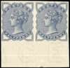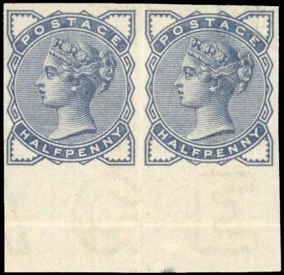 1884 ½d slate-blue lower marginal imperforate pair, folded between impressions and across selvedge, disturbed o.g. Some wrinkling but very rare. SG 187a, £2500