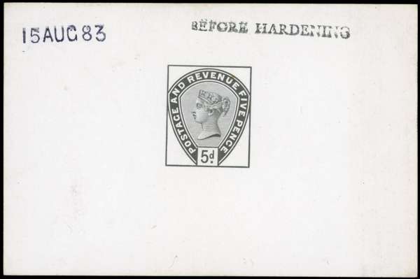 1883 5d Die Proof (the issued Die 2) in black on white glazed card, 92 x 60mm. Endorsed BEFORE HARDENING and dated 15 AUG 83. Very scarce. SG 193