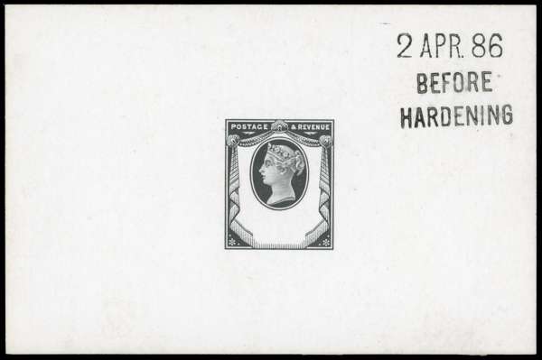 1886 1½d Jubilee Head Plate Die Proof. Very fine, printed in black on white glazed card (92 x 60mm); endorsed BEFORE HARDENING and dated 2 APR 1886. Scarce. Ex "Aureum". SG 198