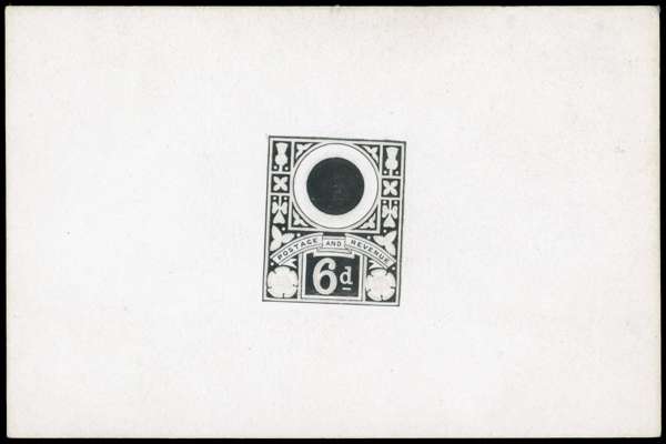 1887 6d Jubilee Die Proof. Very fine embossed die proof of the Type B unadopted design with head area void, numerous minor differences can be seen from the issued design, the most obvious of which is the additional line under the "d" of 6d. Very scarce. Ex "Aureum"
