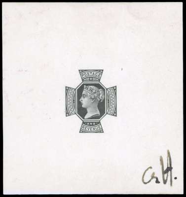 1886 9d Jubilee Head Plate Die Proof (Type A). Very fine, printed in black on white glazed card (57 x 60mm) initialled at foot "G.H.". Scarce. Ex "Aureum". SG 209