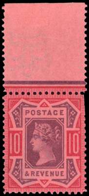 1892 10d Jubilee Colour Trial with watermark inverted, line perf 14. Very fine top marginal, printed on red gummed, Crown watermarked paper. Head plate printed in purple and duty plate in red. Scarce. Ex "Aureum".