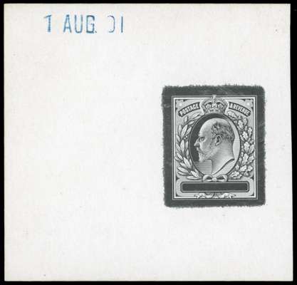 1901 Edward VII ½d, 1d & 6d Master Die Proof. Very fine uncleared example of the head and frame without face value, printed in black on reduced white glazed card (62 x 60mm) dated at upper left in blue "1 AUG. 01". Very scarce.