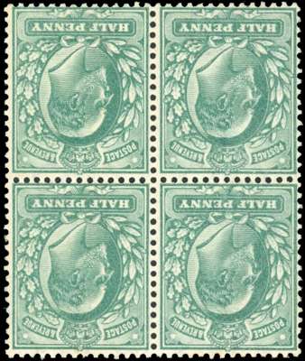 1902 ½d dull blue-green block of four with inverted watermark, unmounted o.g., very rare. SG 215wi, £10000