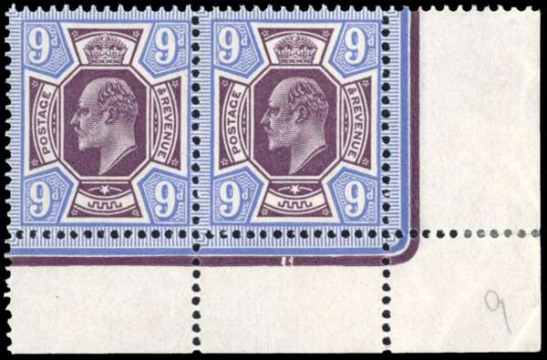 1913 9d deep plum & blue. Very fine unmounted o.g. bottom right corner pair, showing date cuts below the bottom right stamp from the 7th and final printings on plates H3/D(3). Spec. M41(5).