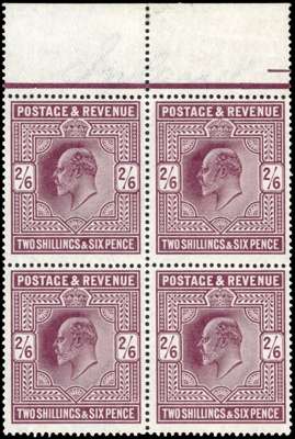 1911 Somerset House 2s6d dark purple upper marginal block of four, hinged on the selvedge only, fine o.g. with the stamps unmounted. SG 317, £3000