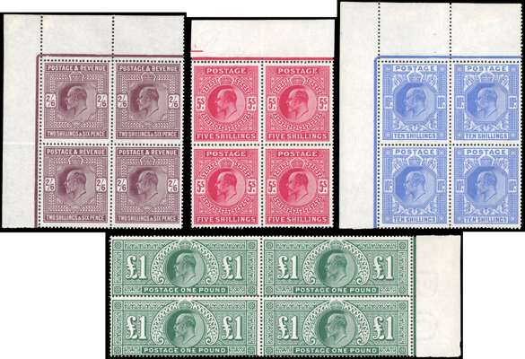 1911 Somerset House KEVII 2s6d dark purple, 5s carmine, 10s blue & £1 deep green in marginal blocks of four, (2s6d & 10s top left marginal blocks), mint unmounted o.g. The 10s block with some gum bends, not detracting from otherwise very fine appearance; very scarce multiples. SG 317-320 cat £27,000+