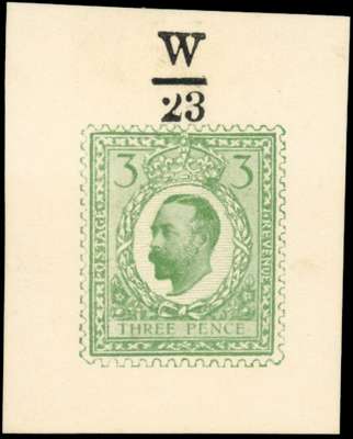 1911-12 Hentschel Small Format colour essay, Winstone & Sons 3d in green on white unwatermarked paper (32x40mm), with handstruck ‘W/23’ in black above. Fine.