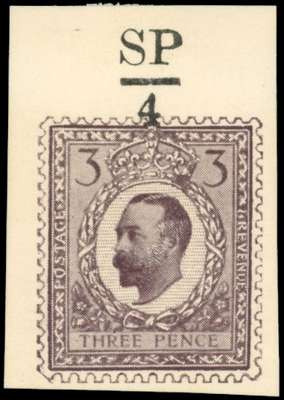 1911-12 Hentschel Small Format colour essay, Slater & Palmer 3d in brown on white unwatermarked paper (23x33mm), with handstruck ‘SP/4’ in black above. Fine.