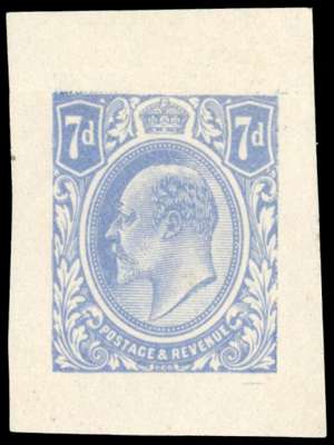 1911 7d colour trial in the King George V colours, printed on gummed unwatermarked paper (25 x 34mm). Small traces of thinning, still a very rare and attractive trial of which only two or three are believed to exist in private hands. SG 249
