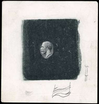 1912 KGV Coinage Head Die Proof (Stage 1g) in black on glazed thick paper (74x70mm), produced at the Royal Mint on 27th February 1912, with pencil notations at sides indicating the proposed alterations to the die, attractive and scarce. SG 351