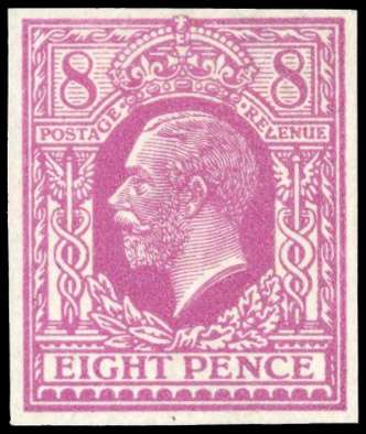1912 8d trial of Eve's Pillar design (22mm, medal head). Very fine o.g. example printed in magenta on Simple Cypher watermarked paper with background of solid colour behind head. Scarce. Fig. 33a. SG 390