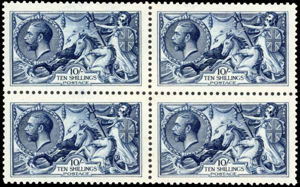 1913 Waterlow 10s indigo-blue. A well centred block of four, unmounted o.g., with fine colour. SG 402, £6000