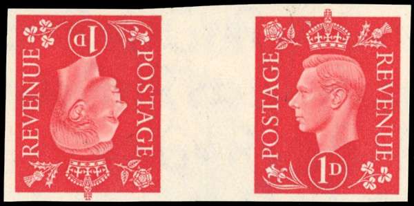 1937 1d scarlet. Very fine unmounted o.g. imperforate tête-bêche imprimatur pair with NPM handstamp on reverse. Vey scarce. Ex NPM Archive sale. SG 463