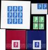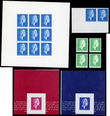 c1970s & 1980s group of Harrisons phosphor and colour trial proofs, including imperforate sheetlet of twelve and horizontal pair, in blue, on PCP/PVAD, two colour trials in bright magenta and ultramarine blue, and four perforated phosphor ‘tagging’ dummy stamps in emerald-green, originating from trial sheets of 100 where the phosphor configurations are in symbols/ characters of ‘@’, ‘%’, a thin bar code and thick bar code, generally fine condition, an interesting lot.